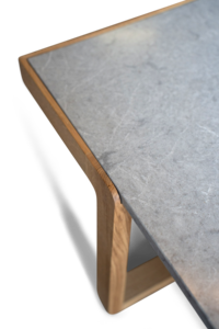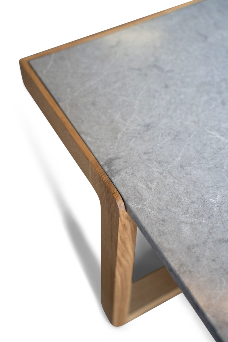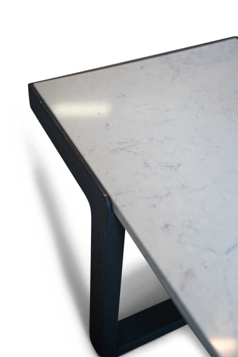 Coffee table with oak frame in walnut, wengé, black or natural finish and quartz composite top.